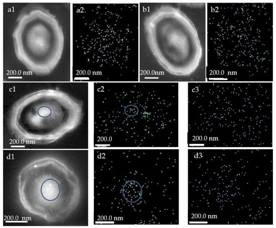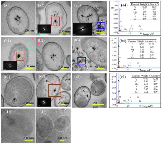 The ultrathin slices of M. gossypii HFF1 cells cultured after 13 days were prepared, according to the reference, and observed using a transmission electron microscope (HRTEM, H-7650, Hitachi) [68,69,70]. In the preparation period of the ultrathin slices, the cells were fixed with glutaraldehyde. The inclusions in the interior of cell were then analyzed using selected area electron diffraction (SAED) (TEM, H-7650, Hitachi). In order to further study the accumulation of Ca and Mg within cells, the ultrathin cell slices were observed using a scanning transmission electron microscopy (STEM, Tecnai G2 F20, FEI, Hillsboro, OR, USA), and the elemental mappings of several elements were obtained [10,69].