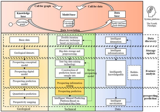 The data generated in intelligent prospecting prediction based on geological big data not only have a simple data layer, but also include an information layer, a knowledge layer, and even a decision-making layer, such as an expert knowledge graph, network structure tree, and intelligent prediction model. For intelligent prospecting, these inference data and knowledge networks have storage value. Currently, there is no such storage system to effectively store and manage all the intermediate data, including basic data, algorithm models, expert knowledge, and common software. Therefore, it is meaningful and challenging to establish an intelligent mineral prediction platform that integrates digital expression, quantitative correlation, virtual simulation, and quantitative prediction with a data base (DB), model base (MB), and knowledge base (KB) as the bases, and with spatiotemporal cloud storage and a spatiotemporal data base, knowledge base, and knowledge graph, as well as high-performance computing, virtual visualization, and application development as the support.