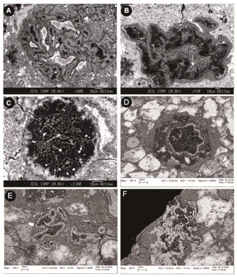 Backscattered electron images of refractory inclusions in GRV 020025 and GRV 050179; (A–C) reproduced from reference [13]: (A,B) type A-like inclusions; c: spinel spherule. (C–F) type A-like inclusions. Sp: spinel; Di: diopside; Ol: olivine; Pv: perovskite; Phy: phyllosilicate; cpx: clinopyroxene.