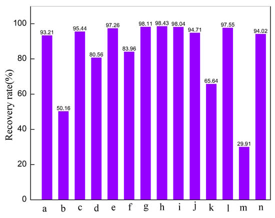 Effect of different inhibitors on the rolling recovery rate of shale (a, 2 %TEYA; b, water; c, 3% polydimethylamine; d, 5% emulsified asphalt; e, 5# white oil; f, 3% small cation; g, 2# oil-based drilling fluids; h, 3# oil-based drilling fluids; i, 5% KCl; j, 5%KCl+ 5% emulsified asphalt; k, 1% CaCl2; l, 5% K2SiO3; m, 5% FeCl3).