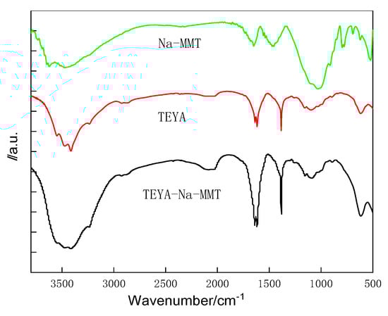 The Na-MMT treated with 1.2% triethylammonium acetate (TEYA) was centrifuged and filtered. During the filtration process, the Na-MMT was carefully rinsed by the mixed solution of absolute ethanol and ethyl acetate. The obtained Na-MMT was vacuum dried at 50 °C for 24 h and then stored in a closed manner. The prepared sample powder was mixed with KBr and pressed into pellets for FT-IR analysis. The FT-IR spectra in the wavelength range of 4000–500 cm−1 were recorded by a WQF-520 Fourier transform infrared spectrometer (Thermo Electron Co., Waltham, MA, USA).