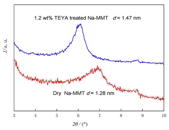 The XRD of dry Na-MMT treated with 1.2 wt% TEYA is shown in Figure 6. From Figure 6 we can see that the crystal layer spacing of dry Na-MMT is 1.28 nm [], and the crystal layer spacing of TEYA/Na MMT is changed to 1.47 nm, which indicated that TEYA had successfully entered into the clay crystal layer and expanded the crystal layer spacing. Due to the occurrence of lattice substitution, the clay surface was negatively charged. The positively charged quaternary ammonium group on TEYA can ensure its strong adsorption on the clay. The molecular weight of TEYA was small and can enter the Na-MMT crystal layer to pull the crystal layer spacing.