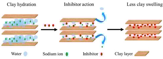 The inhibition mechanism is shown in Figure 7. In the water environment, water molecules increased the spacing of Na-MMT layers, and TEYA entered into the clay crystal layer to replace water molecules, so as to effectively prevent the hydration and expansion of clay [].