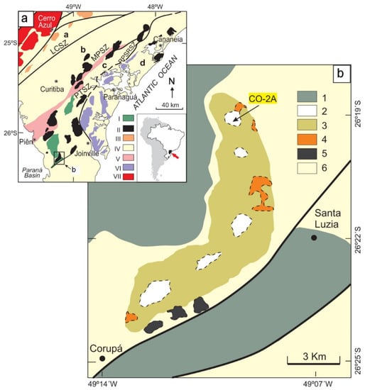 Simplified geological context (a) and map of the Corupá Pluton (b), Southern Brazil [25,32,33,34]. (a): I: Volcano-sedimentary basins; II: “A-type” granitic and syenitic plutons and complexes from the Graciosa Province; III: “A-type” granitic plutons from the Itu Province; IV. A: Ribeira fold belt; b: Curitiba microplate; c: Luiz Alves microplate; d: Coastal granitoid belt. V: Piên-Mandirutuba Granite batholith; VI: Undifferentiated late- to post-collisional granites; VII: Três Córregos batholith. LCSZ: Lancinha Shear Zone; RPSRSZ: Rio Palmital-Serrinha Shear Zone. (b): 1: Sedimentary and volcanic rocks from Guaratubinha Basin (above) and Corupá Graben (below); 2: Alkali-feldspar granites, 3: Alkali-feldspar syenites, 4: Gabbro-diorites and related hybrid rocks, 5: Basic volcanics, 6: Archaean granulitic rocks from the Luis Alves microplate. The location of the studied CO-2A sample is indicated.
