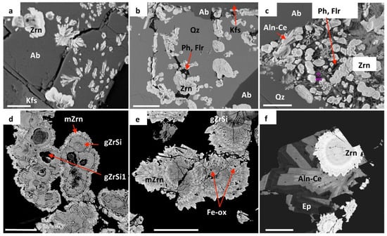 BSE images of hydrothermal zircon aggregates in peralkaline granite from the Corupá Pluton. (a): Dendritic, rosette, oolitic, and other zircon (Zrn) aggregates included in and probably co-precipitated with hydrothermal albite (Ab); note the zoning patterns with grayish or darker core areas and whitish rims. (b): Botryoidal and oolitic hydrothermal zircon, accompanied by minor phyllosilicates (Ph) and fluorite (Flr), filling in fractures in primary quartz (Qz) and protruding a K-feldspar (Kfs) substrate, along with hydrothermal albite. (c): Zoned zircon aggregates with a variety of morphologies, associated with phyllosilicates, fluorite, and allanite-(Ce) (Aln-Ce), filling in a small miarolitic cavity; note the shell-shaped crypto-crystalline aggregate with a concentric zoning pattern in the center of the image. (d): Botryoidal zircon aggregates, with subrounded globules mainly composed of Zr and Si (gZrSi) packed together and enveloped by microcrystalline zircon overgrowths (mZrn); note the dark cores in some globules (gZrSi1) and dark spots in-between globules and overgrowths. (e): Botryoidal aggregate with better-developed microcrystalline aggregates over globular nuclei; note the concentric zoning pattern and Fe-oxide (Fe-ox) “inclusions” and other unidentified dark spots accompanying this pattern. (f): Spherulitic, crypto-to-microcrystalline, fibro-radiated zircon aggregate with concentric zoning pattern, associated with allanite-(Ce) and brighter ferriallanite-(Ce) and epidote (Ep) fibro-radiated aggregate, filling in a miarolitic cavity. White bars measure 10 μm (a–c) and 50 μm (d–f). Mineral abbreviations as recommended by the IMA [46]. See text for discussion.