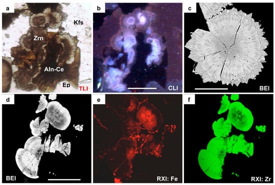 The zircon aggregates occur in close association with hydrothermal mineral phases, particularly albite, epidote-group minerals, phyllosilicates, fluorite and Fe oxides. They appear filing in rock micro-fractures, interstices, and small miarolitic cavities, and they have variable dimensions (from ca. 2 to 80 μm; see Figure 2 and Figure 3). Among the hydrothermal HFSE mineral hosts, zircon is subordinated in relation to the epidote-group minerals, and they both occur in small volumes (<0.1%). The zircon aggregates are morphologically and micro-structurally diverse and present singular and variable habits, such as dendritic, rosette, oolitic, lenticular or semi-lenticular fibro-radiated, spherulitic, and botryoidal, with distinct zoning patterns. Some of these habits resemble those described for hydrothermal zircon in some peralkaline granites and related pegmatites, such as the Ambohimirahavavy (Madagascar), Strange Lake (Canada), and Khan Bogd (Mongolia) complexes [22,44,45]. Idiomorphic or typical “spongy”-textured crystals were not found.