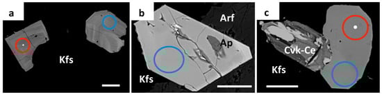 BSE images of magmatic zircon crystals in peralkaline granite from the Corupá Pluton. (a): Euhedral crystals showing oscillatory zoning patterns included in K-feldspar (Kfs); (b) euhedral crystal with slightly zoning and an apatite (Ap) inclusion between K-feldspar and arfvedsonite (Arf); (c) Euhedral crystal with slightly patchy zoning pattern associated with pristine (main brighter area) and hydrothermally altered (darker areas) chevkinite-(Ce) (Cvk-Ce). White dots, red circles, and blue circles indicate the locations of WDS, LA-ICPMS, and LA-MC-ICPMS spot analysis, respectively. The white bars measure 50 μm.