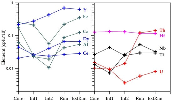 WDS compositional core-to-rim profile illustrating the main chemical (minor and some trace elements) variations, expressed in cations per formula unit (cpfu), of the spherulitic zircon aggregate shown in Figure 3f.