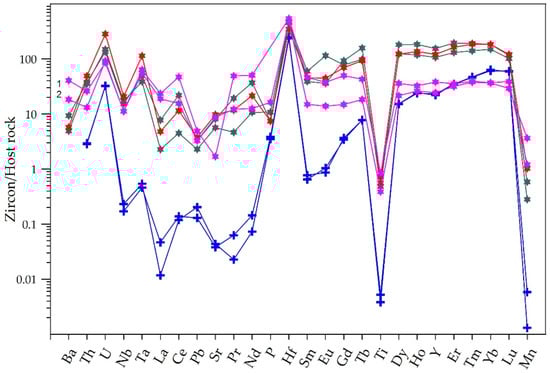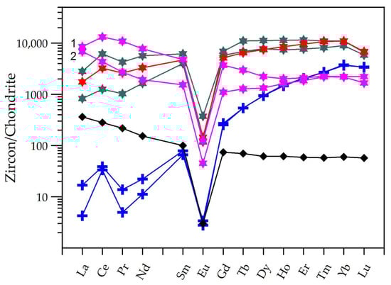Trace-element distribution patterns for primary and hydrothermal zircon, normalized to the CO-2A host granite sample. Symbols: blue cross—primary zircon; green star—botryoidal aggregates; magenta star—fibro-radiated crypto-crystalline aggregates; brown core—(1), colorless overgrowth (2); red star—spherulitic fibro-radiated micro-crystalline aggregate in allanite-(Ce).