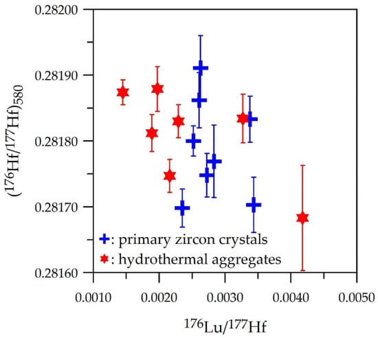 Lu and Hf isotope data (Table 3) for primary and hydrothermal zircon are represented in Figure 8. Initial (176Hf/177Hf)t ratios and related εHf(T) parameters were computed for t = 580 Ma in both cases, as the age of the hydrothermal event could not be constrained and it is likely that the it was not much younger than the main magmatism. The (176Hf/177Hf)580 ratios range from ca. 0.28165 to 0.28200, corresponding to −25.8 < εHf(580) < −17.7, thus indicating an isotopically evolved source for the original magma. It must be noted that the values of the hydrothermal varieties are close to those measured in primary zircon crystals, considering the involved analytical errors. These results are compatible with an essentially orthomagmatic source for such elements.