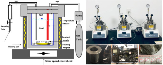 The experiments are conducted in three reaction autoclaves (Figure 3). Each autoclave has a capacity of 100 mL. The autoclaves are made of 316 L stainless steel and support a magnetic steering function. The inner liner of the reactor is made of quartz material. The temperature detector and the sampling pipe is made of Hastelloy C276, a Ni-Cr-Mo wrought alloy generally considered a versatile corrosion resistant alloy material. The experimental procedures are as follows: