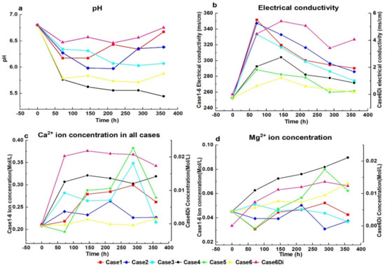 Evolution of the pH and electrical conductivity in brine during the experiments (a,b). Concentration changes of the major ions Mg2+ and Ca2+ (c,d).