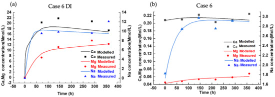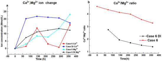The increase in Ca2+ and Mg2+ concentrations for Case 6 and Case 6 DI (a). Change of Ca2+/Mg2+ concentration ratio for Case 6 and Case 6 DI (b).