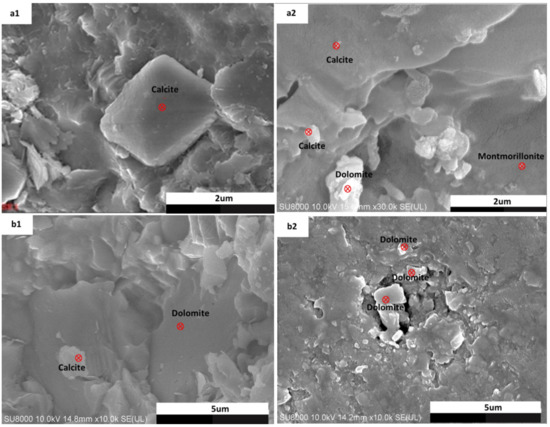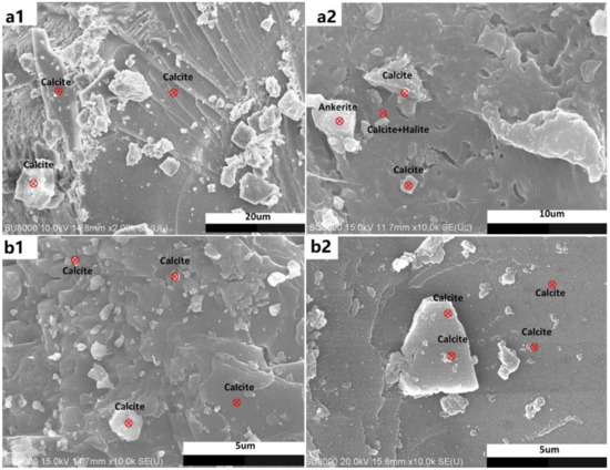 Scanning electron microscope (SEM) analyses of rock samples before and after experiments illustrate the dissolution of calcite and dolomite. Before the experiment, mineral surfaces of calcite and dolomite were generally smooth (Figure 7a1,b1), whereas with the start of dissolution, corrosion pits and smaller particles at the surfaces become more evident afterward (Figure 7a2,b2). The higher resolution images in Case 4 and Case 6 (Figure 8) show that after the experiment, heavy corrosion occurs, which produces a rough surface morphology mainly caused by calcite and dolomite dissolution. In Case 6 the corrosion pits are very obvious (Figure 8b2). From the EDS and XRD analysis after the experiment, some secondary mineral formations like halite, ankerite (Figure 7a2), montmorillonite (Figure 7b2), and kaolinite can be observed (Equations (6)–(8)). The Fe2+ may come from some iron-bearing, unobserved primary minerals that were not detected.