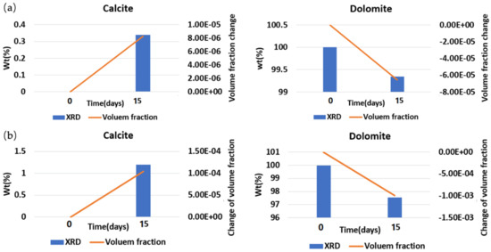 By the method noted above, it was found that the porosity of Case 1, Case 2, Case 4, and Case 5 increased, whereas the porosity of Case 3 and Case 6 decreased after the reactions. This is consistent with the comparison of mineral changes before and after the reaction, except for Case 5. These porosity changes are because of mineral dissolution and precipitation. In all cases, calcite and dolomite composition change is inversely proportional. We can relate this phenomenon to calcite and dolomite displacement by dolomitization and dedolomitization. In proper conditions, the reaction speed of dolomitization can happen in days [53]. When calcite and dolomite alternate, the process of calcite decreasing and transforming into dolomite contributes to dolomitization and increases the lithologic porosity by up to a maximum of 13% [54,55]. Therefore, it can be considered that the dolomitization process in Case 1, Case 2, and Case 4 also increase the rock porosity. Compared with the calcite-rich groups, the increments of porosity in dolomite-rich groups are larger. A possible reason is that more dolomite content can initially dissolve and enrich the Mg2+ content in the brine, which can promote the dolomitization process. In Case 3 and Case 6, the mineral displacement is not sufficient and could result in a decrease in porosity with the precipitated more calcite (Table 8).