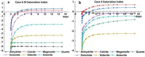 Variations of mineral saturation indexes in the first 15 days: (a) Case 6 DI; (b) Case 6.