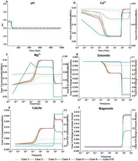 In the calcite-rich carbonates, Ca2+ increases slowly in the early stage and starts to decline after about 0.5 years. Similarly, Mg2+ also increases slowly in the early stage, but the increase accelerates after 0.1 years. The reason is that the precipitation of calcite overwhelms the dissolution of calcite after 0.1 years, while the dissolution rate of dolomite further increases. It also can be seen that the increase rate of calcite in Case 3 was the fastest, and that in Case 1 was the slowest. In addition, the dolomite-rich cases (Case 4–Case 6) show that the reaction rate of Case 4 is higher than those of Case 6 and Case 5. This corresponds to the higher reaction rate of the mineral transformation when the calcite or dolomite content is in the 50–90% interval. Therefore, it can be determined that, to reach more mineralized CO2, dolomite or limestone formation lithology purity should be less than 10%.