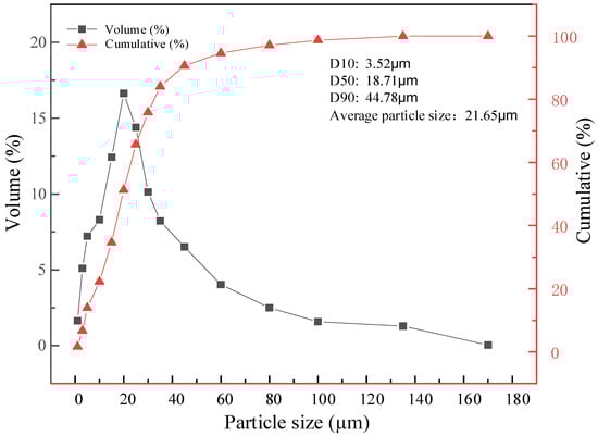 Figure 1 shows that there is a large amount of fine particles in the tailings sample. The contents of samples with particle sizes of 1 µm, 30 µm, and 45 µm are 8.30%, 10.13%, and 6.51%, respectively. In the sample, the particle size of −3.52 µm accounts for 10% of the total sample size, the particle size of −18.71 µm accounts for 50%, the particle size of −44.78 µm accounts for 90%, and the average particle size of the sample is 21.65 µm, and the tailings belong to ultra-fine iron tailings.