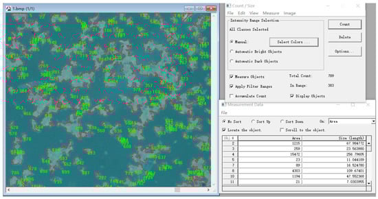 In the above-mentioned settling speed measuring method, 60 s after the beginning of pulp sedimentation, a sample at the 20 mL scale of the graduated cylinder was taken with a Babbitt dropper to prepare a floc structure analysis sample. The prepared flocs were observed under a microscope, and the collected images were processed by Image-Pro Plus 6.0 software. Opening the image of floc to be measured, the corresponding scale was selected for calibration, the parameters of floc diameter and area to be measured were selected, and the outline of floc was extracted. The extracted contour was labeled in red, and the software automatically converted the pixel length into the actual length and output it. The average particle size and area of flocs was calculated according to the particle size and area of each floc output by the software. The process is shown in Figure 3.