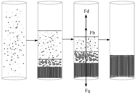 Assuming that under the same test conditions and time, each particle is spherical and its diameter and density are equal, and the particles settle under the combined action of gravity, resistance, and buoyancy [36,37,38], the settling process of the particles and its stress situation are established as shown in Figure 4.