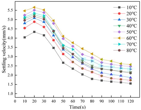 According to Figure 5, during the initial settlement, with the increase in the settling time, the settling velocity of the tailings floc particles first increased and then decreased. At the time of settling for 20 s, the settling velocity reached the maximum and the tailings floc particles completed the accelerated settling process at this stage; after that, with the increase in the settling time, the settling velocity gradually decreased. When the settling time was 120 s, the settling velocity changed little, indicating that the overflow ultrafine tailings settling had been completed when the settling time was 120 s. It can be seen that, with the increase in slurry temperature, the settling velocity of overflow superfine tailings gradually increases. When the settling time is 20 s, the settling velocity is 4.33 mm/s at a constant temperature of 10 °C, and the maximum settling velocity is 5.66 mm/s at a constant temperature of 60 °C. However, when the temperature exceeds 60 °C, the settling velocity of tailings gradually decreases. When the temperature increases from 60 °C to 70 °C and 80 °C, the settling velocity decreases from 5.66 mm/s to 5.35 mm/s and 5.17 mm/s.