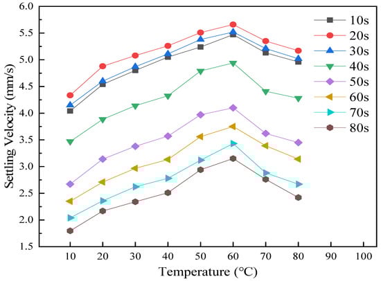 Figure 6 shows the relationship between the settling velocity of tailings and temperature at different settling times (10–80 s). The settling velocity of ultrafine tailings reaches the maximum when settling for 20 s, and then the settling velocity of ultrafine tailings gradually decreases with the increase in settling time. Under the same settling time, when the temperature is less than 60 °C, the settling velocity of ultrafine tailings increases with the increase in temperature, When the temperature is greater than 60 °C, the settling velocity decreases with the increase in temperature. When the settling time is 80 s and the temperature is less than 60 °C, the settling velocity increases from 1.8 mm/s at 10 °C to 2.17 mm/s, 2.34 mm/s, 2.51 mm/s, 2.94 mm/s, and 3.15 mm/s, and the settling velocity changes greatly with the increase in temperature. When the temperature is greater than 60 °C, the settling velocity decreases from 3.15 mm/s at 60 °C to 2.76 mm/s and 2.42 mm/s, and the settling velocity decreases with the increase in temperature.