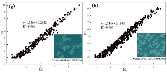 According to the above steps, the obtained floc samples are processed, and the collected floc images are processed by Image-Pro Plus 6.0 software, so that the particle size and area can be obtained. From the double logarithm curve of ln L−ln S, the slope of the curve is its fractal dimension. The average particle size and fractal dimension of tailings flocs at different temperatures are shown in Figure 7.