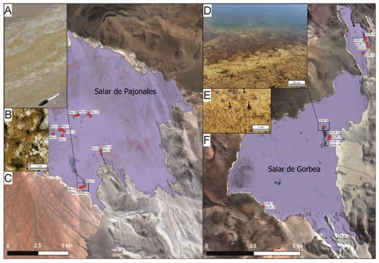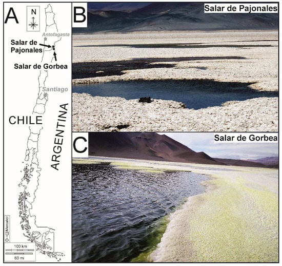 - Tebes-Cayo, C.; Demergasso, C.; Chong, G.; Cabestrero, Ó.; Sanz-Montero, M.E.; Castro-Nallar, E.; Cabrol, N. Geochemistry and microbial communities in Salar de Pajonales and Salar de Gorbea, Northern Chile: Influence on the gypsum microbialites formation. Geotemas 2021, 18, 458–462. [Google Scholar]