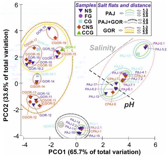 - Rasuk, M.C.; Kurth, D.; Flores, M.R.; Contreras, M.; Novoa, F.; Poire, D.; Farias, M.E. Microbial characterization of microbial ecosystems associated to evaporites domes of gypsum in Salar de Llamara in Atacama Desert. Microb. Ecol. 2014, 68, 483–494. [Google Scholar] [CrossRef]