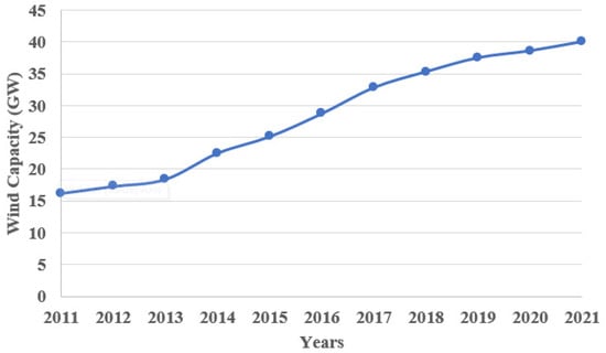 India’s wind power development is tremendous and proving to become an avenue to overcome the problems of meeting demands for electricity, environmental degradation, emission of greenhouse gases, and depletion of natural resources. As a source of energy, the installed wind power capacity is enormous in India and contributes as the fourth highest installed wind power capacity in the world after China, the US, and Germany. The cumulative installed capacity of wind energy is 40.0 GW out of 104 GW of renewable capacity in 2021 [32]. An increasing trend in the installed capacity of wind energy is presented in Figure 1. It is noticed in Figure 1 that the cumulative installed capacity of wind power has continuously increased from 16.2 GW to 40.0 GW in India between 2011 and 2021 [33].