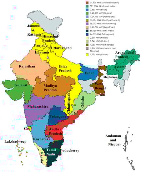 Wind power is renewable, inexhaustible, environmentally friendly, developing technology, and one of the green energy alternatives among all available renewable resources. Renewable energies are claimed to be efficient and sustainable and are used to meet energy requirements at low costs and with higher productivity. India has immense wind energy potential, mostly located in the southern, western, and northern regions of the country (Figure 2). Considering the country’s rapidly changing energy scenario, it is necessary to assess the wind power potential to install wind turbines in near future. The potential of wind power varies according to geographic locations, wind density, wind speed variation, and height from ground level. The wind energy potential at 50 m hub height is estimated at 49 GW while it is 102.8 GW at 80 m height. India’s northern and north-eastern states are located in the trans-Himalayan region, and the isolated Andaman & Nicobar Islands contribute only 0.5% land availability, while the remaining other states contribute 2% land availability for wind energy estimation [35]. At higher AGL (above ground level), India’s wind potential can increase from 302 GW at 100 m AGL to 695.5 GW at 120 m AGL. Total wind power potential at 120 m ground level can be seen in Figure 2 for different states of India [35]. It depicts that India’s wind power contributes substantial wind capacity in southern and western states while other states with lower potential are in the developing stage. On basis of land categorization, 695.5 GW wind potential can be produced from 80% potential land availability in wasteland areas, 30% potential land availability in cultivable land areas, and 5% potential land availability in the forest land.