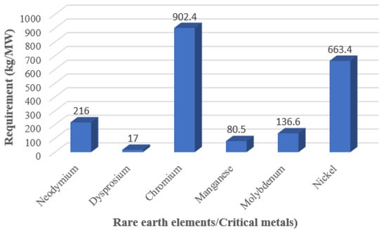 Other critical metals used for wind turbine technology are chromium (Cr), manganese (Mn), molybdenum (Mo), and nickel (Ni). These critical metals are used as an alloy. In wind turbines, Mo is used with high-strength steel, and Ni is used as an alloy in stainless steel. Stainless steel with 12%–18% Cr and super-stainless steel with 12%–30% Cr and 7%–10% Ni add strength, hardness, and toughness to their alloys. It also resists corrosion and inhibits steel abrasion, as well as reduces oxidation. In India, nickel is present in form of oxides, sulfides, and silicates, and the reserve is estimated as 189 Mt [33]. The reserves for manganese ore and molybdenum are 495.87 Mt and 19.37 Mt, respectively [33,34]. The demand for these critical metals in kg for one MW has been presented in Figure 3. It is observed from Figure 4 that the demand for Mn and Mo is less compared to Ni and Cr.