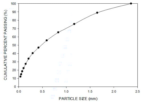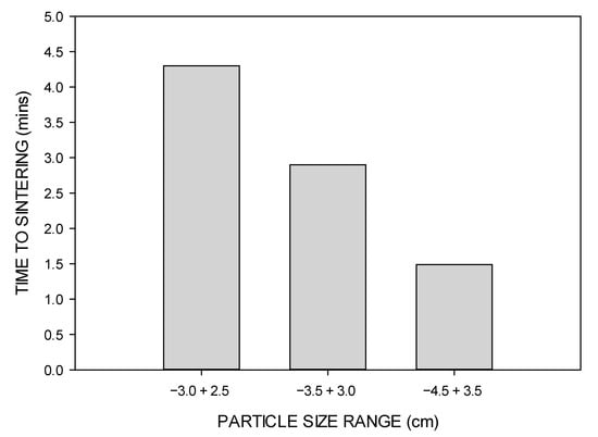 Since the chemical compositions and the mineralogies of the ores were similar, then their utilization for the various aspects of the experimental work was mainly determined by their physical characteristics. Bauxite (1) was composed of relatively fine irregular particles with a wide particle size distribution and was used in the TGA, permittivity and heating behavior studies. The particle size distribution of this bauxite was analyzed by dry sieving using Tyler screens in a vibrating sieve shaker, and the results are shown in Figure 2. The particle size was below 2.362 mm, and the sample mass in each size fraction was relatively uniform. The pisolitic bauxite ore (2) was employed for the compressive strength index studies, as it was approximately spherical. The particle size range of −6.680 + 4.699 mm was utilized in the tests, and this size range was obtained by dry sieving. The bauxite (3) sample was relatively coarse and was used to investigate the effect of sample size on the compressive strength. It was crushed and sized into three coarse size ranges of −4.5 + 3.5 cm, −3.5 + 3.0 cm and −3.0 + 2.5 cm.