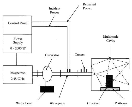 Prior to the compressive strength studies, the bauxite ores (2 or 3) were preheated either in a conventional laboratory resistance furnace or in a microwave cavity. The maximum power of the conventional furnace was 1200 W (120 V, 10 A). Figure 2 shows a schematic diagram of the microwave system employed in this work. The major features were a power supply, a control panel, a 2.45 GHz air-cooled magnetron, a rectangular aluminum waveguide, a circulator and a multimode cavity containing the sample to be processed. The Model P2000L power supply was manufactured by Conversion Technology Corporation (CTC, Southlake, TX, USA). The incident power could be varied continuously from 0 to 2000 W, and the microwaves traveled along the rectangular waveguide to the cavity. The cavity dimensions were 26 cm in height, 40 cm in width and 40 cm in length. The samples to be processed were placed in a cylindrical quartz crucible on a platform, at the center of the base. The cylindrical quartz crucible had the following dimensions: 37 mm in height, 28 mm in diameter and 1.5 mm in thickness. The microwave transparent platform was made from 80% Al2O3 and 20% SiO2. As illustrated by the dashed lines in the cavity, the microwaves can be absorbed, reflected or transmitted by the sample but only reflected by the walls. Any microwaves not absorbed by the sample will eventually return back down the waveguide and will be absorbed by the water load. Additionally, both the incident and the reflected microwave power were monitored using two detectors installed in the waveguide. The three stub tuners in the waveguide were utilized to manually adjust the incident microwave power in order to minimize the reflected power by matching the incident power with the load.