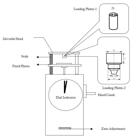 The compressive strengths of the bauxite ore (2) pisoids after both conventional and microwave heating were measured. Additionally, for comparison purposes, the strength index of the as-received bauxite ore was determined. The compressive strengths were measured using a Chatillon compression pellet tester, as shown in Figure 3. The tester consisted of a movable head, a loading platen, a fixed platen and a dial indicator to show the load at failure. The sample was placed between the loading and the fixed platen and was compressed uniaxially. The cylindrical loading platen had a diameter of 25 mm, and the sample height could be measured using a scale. The zero adjustment was utilized to set the load to zero before the sample was compressed.