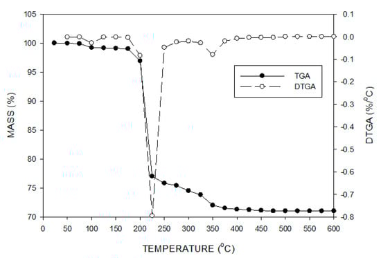 In order to define the decomposition processes for the bauxite ores, and consequently, their effects on the permitivities, thermogravimetric analysis (TGA) studies were performed. The results for bauxite ore (1) are shown in Figure 5 and include the DTGA calculations. For bauxite ore (1), from room temperature, about 1% free water was removed with the rate of removal reaching a maximum at about 100 °C. Subsequently, the mass loss remained relatively constant before increasing slowly at 175 °C, then more rapidly, and reaching a maximum rate at about 225 °C. Then, the rate decreased rapidly to about 250 °C and then more slowly. From 175 °C to 250 °C, the mass loss for the ore was about 23% as compared to the theoretical value of 18.5% for the gibbsite in the ore and 23.1% for pure gibbsite for decomposition to boehmite. These values would indicate that the gibbsite in the ore decomposed into boehmite, but also, some alumina was produced. As the temperature increased further, the rate leveled off but increased once more at about 300 °C, reached a maximum at about 350 °C and eventually began to approach a very slow rate at 400 °C. Over this temperature range, the mass loss was about 4.5%, and here, the remaining more stable boehmite was converted into alumina. The rate of mass change became zero above 475 °C. The total mass loss was 29%, which was in good agreement with the LOI of about 28%.