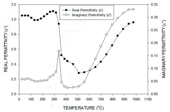 Figure 6 shows the real and imaginary permitivities of bauxite ore (1) as a function of temperature at 2460 MHz. At room temperature, the real and imaginary permitivities were 3.05 and 0.0574, respectively. In general, both the real and the imaginary permittivities exhibited similar behaviors as a function of temperature. From room temperature to about 100 °C, both permitivities remained relatively constant but then began to drop after the free water was removed. At about 150 °C, both permitivities began to increase slowly and then more quickly up to maximums at about 290 °C for the real permittivity and 330 °C for the imaginary permittivity. Here, as shown by the TGA results in Figure 5, the majority of the water had been removed, and the decomposition of gibbsite to boehmite had occurred, with very little impact on the permitivities. Consequently, the significant increases in the permitivities would be attributed to the conversion of boehmite to alumina. This dehydroxylation process involves the migration of protons, which combine with hydroxyl ions to form water vapor, and this results in an increase in the permitivities. Subsequently, both permitivities dropped precipitously, as the rates of dewatering decreased. The imaginary permittivity leveled off at about 300 °C and the real permittivity at about 500 °C. Thereafter, both the real and the imaginary permitivities increased slowly with temperature and then more rapidly. As the temperature approached 1000 °C, the rate of rise of the permitivities began to decrease. The imaginary permittivity shows much larger changes than the real permittivity during dewatering. Additionally, the effect of temperature is more significant, as it is directly related to conductivity, as given by Equation (6). The real and the imaginary permitivities after cooling down to room temperature were 2.14 and 0.0468. Compared to the initial values, this decrease reflects the loss of water from the sample, in particular the removal of hydroxyl ions, and thus, the higher permittivities of the water-containing ores. Additionally, it can be noted that the real permitivities did not change significantly over the whole temperature range, and the value at 1000 °C was lower than the room temperature value. On the other hand, the imaginary permittivities increased dramatically from room temperature up to 1000 °C.