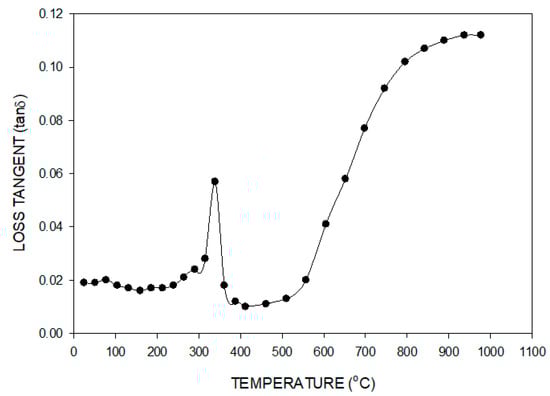 The loss tangent of bauxite (1) was calculated using Equation (7) and is shown in Figure 7. Here, it can be seen that the behavior of the loss tangent was very similar to that of the imaginary permittivity, since the numerical value of the real permittivity did not change significantly across the whole temperature range. There are two regions where the loss tangent underwent significant changes. Firstly, from about 200 °C, the loss tangent increased slowly, then more rapidly, reached a maximum of 0.057 at 340 °C and then decreased before leveling off at about 400 °C. This peak was mainly attributed to the dehydroxylation of boehmite. In comparison to the imaginary permittivity, the peak for the loss tangent was shifted to somewhat higher temperatures. Secondly, above 400 °C, the loss tangent increased slowly and then more rapidly before leveling off at 0.112 at about 1000 °C. This increase with temperature was due to the increase in the imaginary permittivity due to the increase of conductivity with temperature.