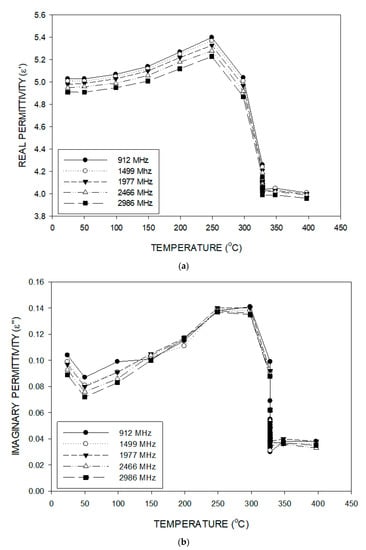 With regard to the effect of frequency, below the maximum and up to about 300 °C, the real permittivity increased with decreasing frequency. From 300 °C, there was a diminishing frequency effect up to about 325 °C, and subsequently, the real permittivity increased with decreasing frequency. In general, during the temperature range over which dewatering occurred, frequency did not have a significant effect on the real permitivities. For the imaginary permitivities, there was a frequency dependency below about 150 °C, and in a manner similar to the real permittivity, the imaginary permittivity decreased with increasing frequency. This frequency dependency below about 150 °C could be attributed to the presence of free or weakly bonded water. However, above 150 °C, there was very little frequency dependency for the imaginary permittivity.