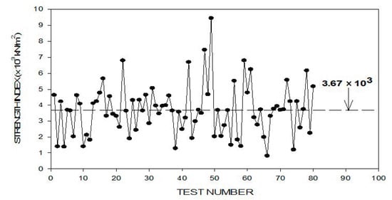 where P is the failure load (kN), h is the sample height (m), and I is the strength index (kN/m2).
