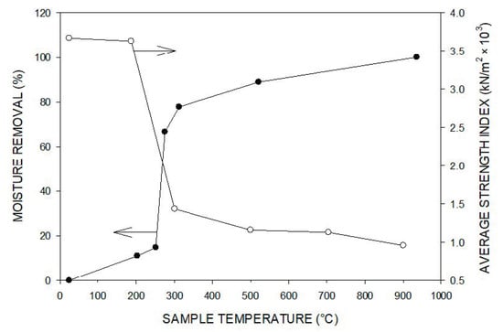 Figure 11. Percent moisture removal and average strength index versus sample temperature for conventionally heated bauxite (2) pisoid samples.