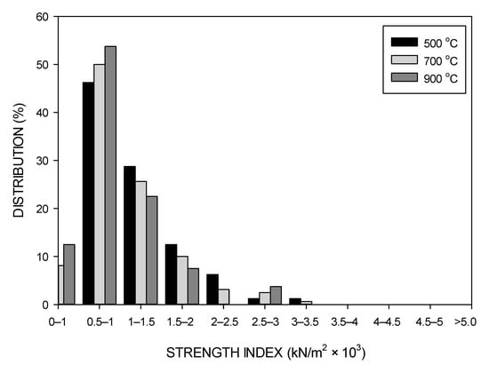 Figure 12. Distribution of the average strength indices for conventionally heated bauxite (2) pisoid samples at 500 °C.
