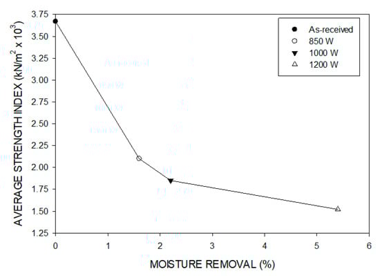 Figure 13. Effect of moisture removal on the average strength index for the as-received sample and for microwave-heated bauxite (2) pisoid samples at 850 W, 1000 W and 1200 W for 2 min.