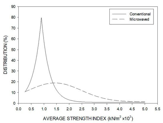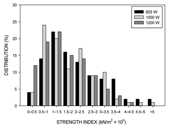 Figure 14. Distribution of the average strength indices for microwave-heated bauxite (2) pisoid samples at 825 W, 1000 W and 1200 W for 2 min.