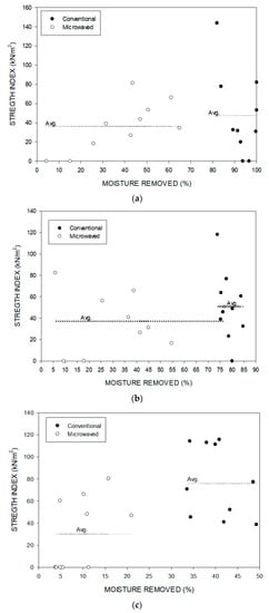 There is very little information in the literature regarding the effects of microwave dewatering of ores or minerals on their mechanical properties. Peinsitt et al. have investigated the properties of both dry and water saturated granite, basalt and sandstone using uniaxial compressive strength and P-wave velocity testing [35]. After microwave irradiation, the water saturated samples were weaker, and this was more significant for sandstone than for granite, and there was no effect for basalt. Large cracks and bursting were observed to occur in the sandstone. These results would indicate that the weakening effect was more pronounced for the porous rocks. In some materials such as coal, it has been shown that microwaves can facilitate fracturing and hence lower the mechanical strength of the material [36,37,38]. Huang et al. have reported that water saturation levels between 25% and 50% can provide optimum microwave fracturing in coal [39]. In general, this phenomenon can occur by at least three mechanisms. Firstly, selective heating of different phases in the coal can result in thermal stress fracturing along grain boundaries. Secondly, the microwaves can cause microdamage of the pore structure. This damage can accumulate and become macrodamage, which can ultimately result in crack formation. This method of crack formation is different than in conventional heating, and also, the crack formation can be more extensive. Thirdly, water trapped in pores and cracks below the surface can be heated above its boiling point, and the resulting internal pressures can induce fracturing.