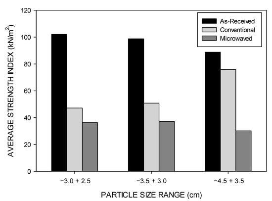 Figure 19. Strength index of the as-received, conventional and microwaved samples for the three particle size ranges: −3.0 + 2.5 cm, −3.5 + 3.0 cm and −4.5 + 3.5 cm.