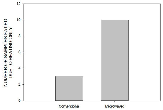 Figure 20. Number of samples that failed due to heating only for both conventional and microwave heating.