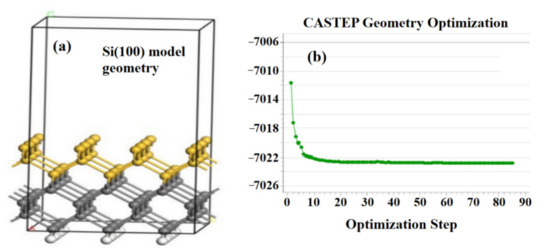 Figure 1a shows the geometric structure of the model Si(100) unit cell. Its surface contains three types of Si atoms: top, bridge and acupoint Si atoms. To study the adsorption of related molecules on the polysilicon (100) surface, a complete unit cell surface must first be established. The thickness of the vacuum layer was set to 12 Å to avoid layer-to-layer interactions. In the process of establishing the model, in order to satisfy the stability of the model and the accuracy of the experiment at the same time, we did not impose any restrictions on the upper three layers of atoms but fixed the lower four layers of atoms. Simultaneously, to saturate the covalent bonds of each silicon atom in the bottom layer, two H atoms were added to each Si atom in the bottom layer, adding hydrogen atom at the bottom can increase the stability of the model, and the silica–hydrogen bond at the bottom is conducive to the stable convergence of the model, and the surface and near-surface layer atoms were fully relaxed. The supercell chemical formula for the entire unit cell is Si83H9. After surface optimization, the optimization curve finally reached a stable convergence state, as shown in Figure 1b, which proved that the surface structure met the experimental requirements.