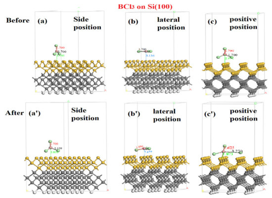 Diagrams of the molecular structure and distance of BCl3 before and after adsorption on the Si(100) surface. Diagrams (a–c) show the adsorption structure before reaction, (a’–c’) the adsorption structure after the reaction, ((a,a’) show side position of the molecule, (b,b’), lateral position of the molecule, and (c,c’) positive position of the molecule).
