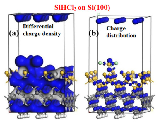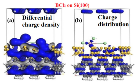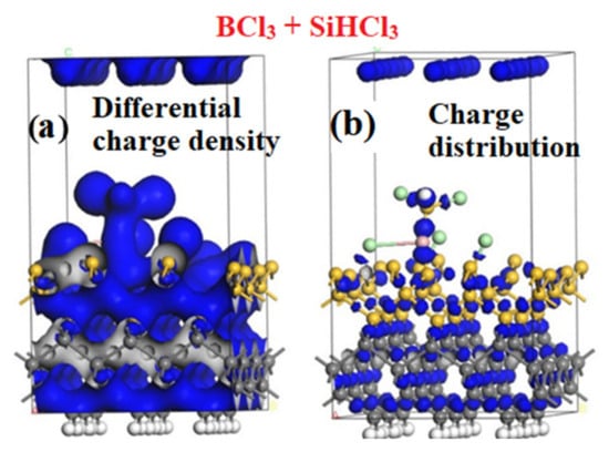 A microscopic electronic analysis was also performed of the charge distribution and differential electron density when BCl3 and SiHCl3 are present together on the surface of polysilicon. The darker blue color between BCl3 and SiHCl3 in Figure 7b indicates that there is a large amount of electron transfer, and it can be seen that the B–Cl bond in the BCl3 molecule is distinctly elongated, and a dissociated Cl atom is adsorbed on the Si(100) surface, indicating that it charge transfer has occurred during the adsorption process. From the charge density results in Figure 7a, indicating charge transfer between the surface and the molecules, we can also see where the electrons accumulate, which proves the occurrence of the adsorption reaction.